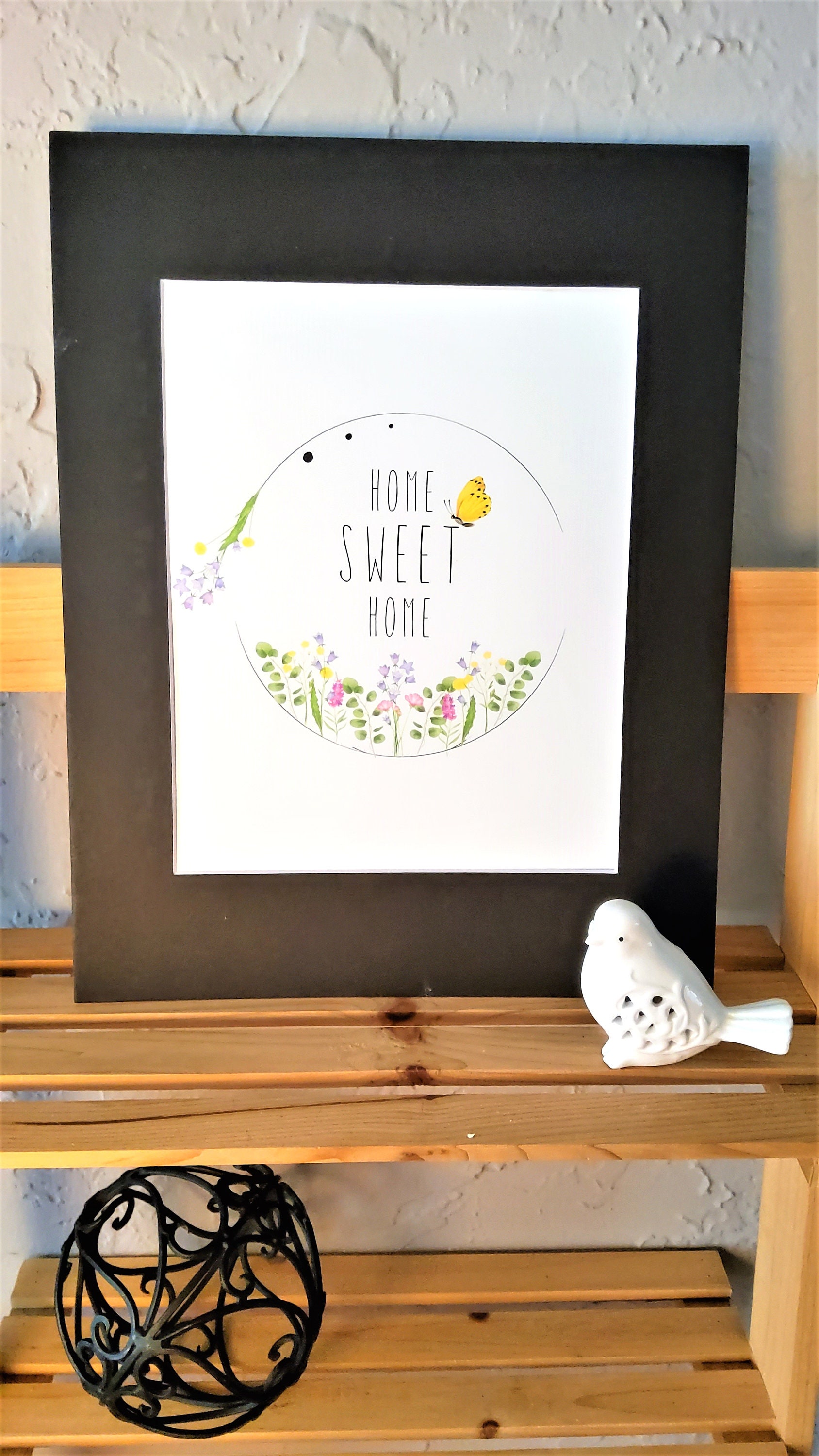 Our Home Sweet Home art print is really sweet. It features wildflowers in pink, yellow and purple and a little yellow butterfly in a simple, but (we think) rather charming design. It comes with the black mat and measures 11 by 14 inches with a vertical orientation.
