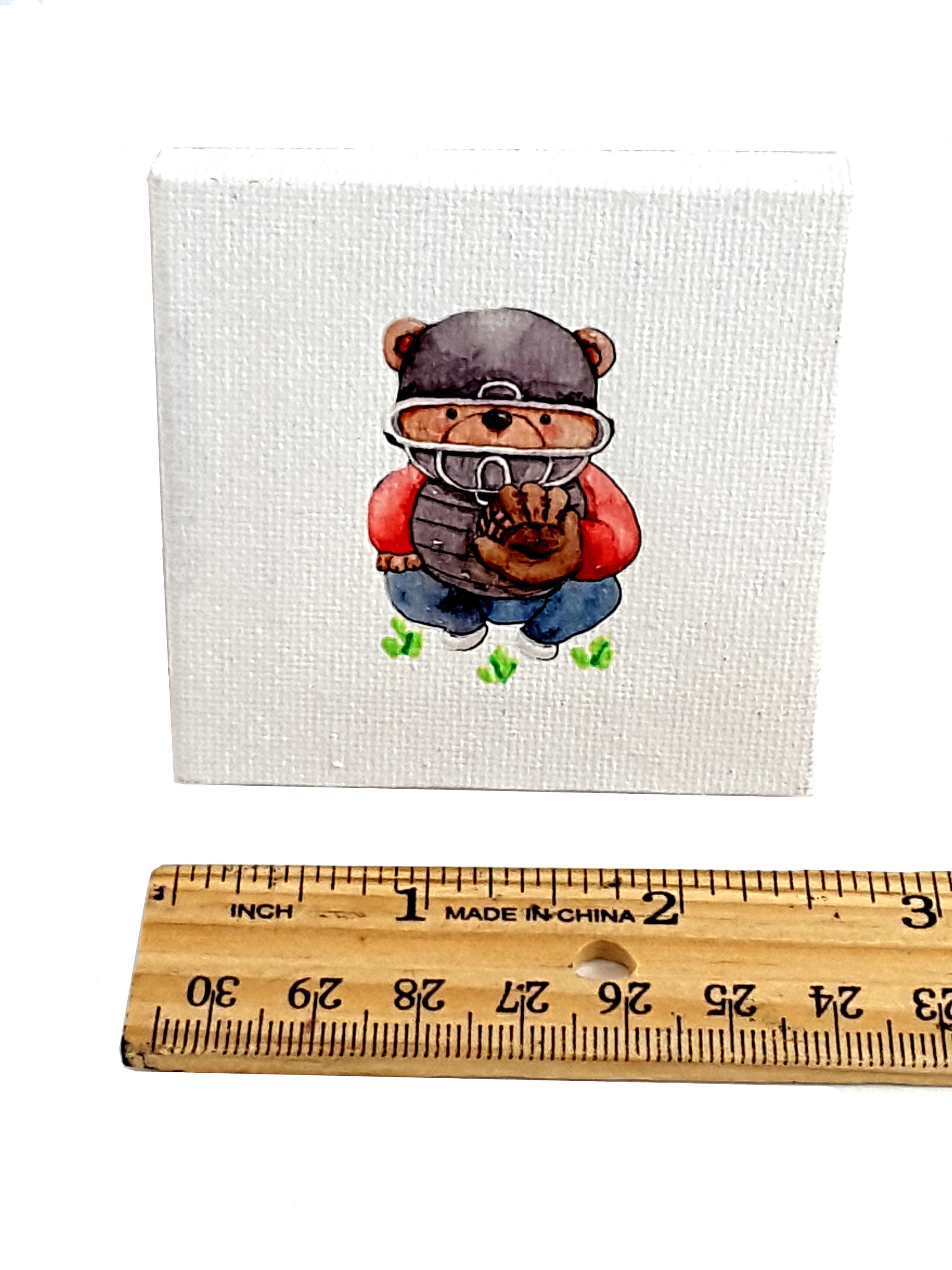 Just under 3 by 3 inches, this white stretched canvas features an adorable little teddy bear baseball catcher made using sublimation printing and decoupage. It comes with a coordinating painted wood easel, your choice of either black, blue, or red, that measures approximately 4 1/2 inches by 2 3/4 inches. Looks great on a shelf or table top in a boy's bedroom or nursery. Makes a great gift for the little guys in your life who loves baseball.